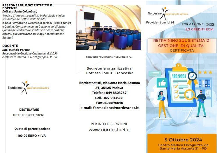 Il corso si propone di aggiornare le conoscenze relative alla Norma UNI EN ISO9001:2015, al Sistema integrato UNI EN ISO9001:2015, Autorizzazione all'Esercizio e Accreditamento Istituzionale e alla gestione dei rischi.