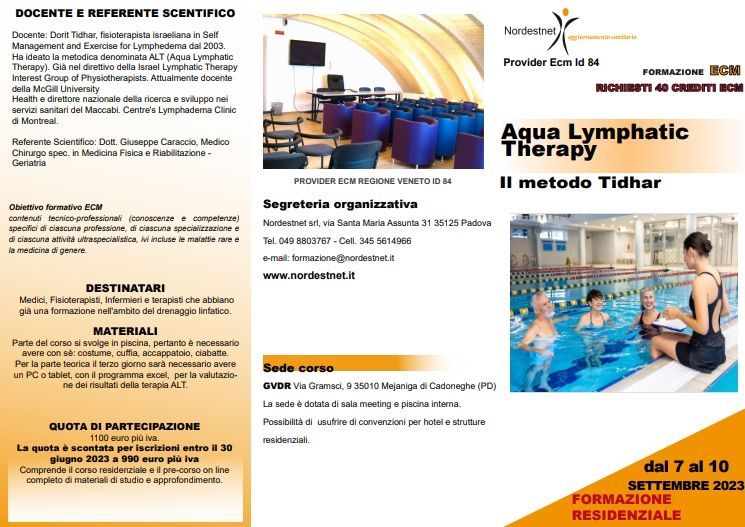 Il programma sviluppato da Dorit Tidhar denominato ALT risulta una metodica innovative nel panorama riabilitativo linfologico che tratta un programma di movimento e di esercizi terapeutici in acqua delicati e ritmici, associati a esercizi respiratori, messi a punto allo scopo di permettere la rieducazione degli arti edematosi con linfedema per contribuire al mantenimento e al raggiungimento del benessere dei pazienti, di tutte le età. Scopo del corso è quindi formare terapisti in grado di