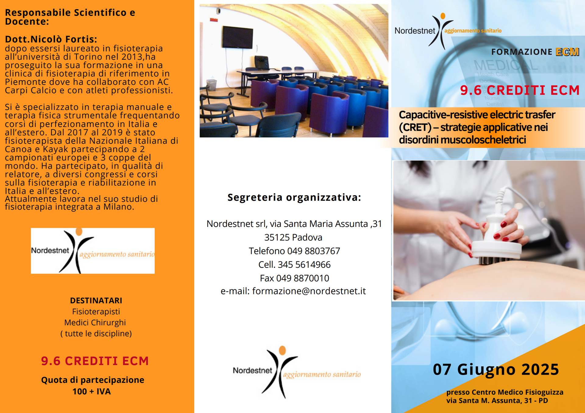 Un corso teorico-pratico pensato per fisioterapisti che desiderano approfondire l’utilizzo della CRET (Capacitive resistive electric transfer) in ambito riabilitativo. La giornata formativa offrirà un ripasso essenziale sui principi di funzionamento e sulle caratteristiche della CRET, seguito da un’ampia sessionepratica dedicata all’applicazione clinica. I partecipanti avranno l’opportunità di apprendere e perfezionare l’utilizzo degli elettrodi manuali e statici, sperimentando direttamente protocolli e strategie terapeutiche per diverse aree anatomiche.